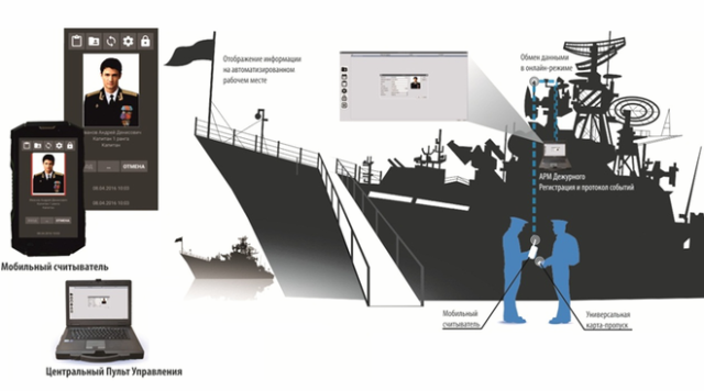При попытке несанкционированного доступа на корабль мобильный считыватель выдает звуковой сигнал, на экране высвечивается строка «Незарегистрированный пропуск» и появляется красное окно «ТРЕВОГА».